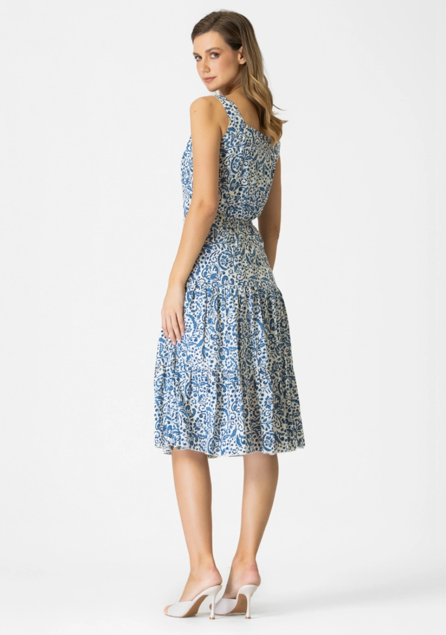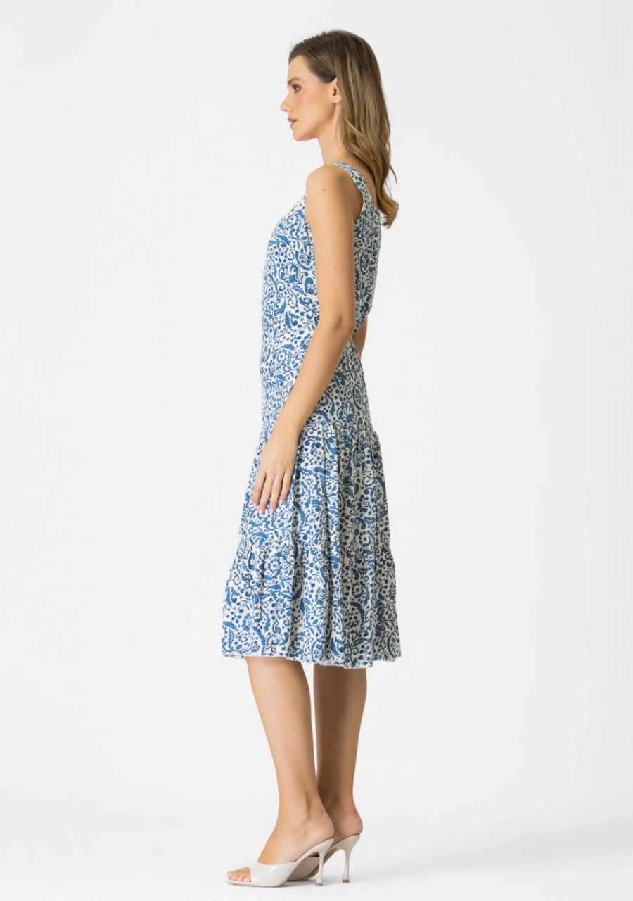 Φόρεμα αμάνικο εμπριμέ με βολάν σε ύφασμα βισκόζ ( φυσικό). Διαθέτει βαμβακερή φόδρα εσωτερικά, κρυφό φερμουάρ στο πλάι και λάστιχο πίσω.Ελληνικής παραγωγής.ΕΠΙΛΕΞΤΕ ΕΝΑ ΝΟΥΜΕΡΟ ΜΕΓΑΛΥΤΕΡΟ!