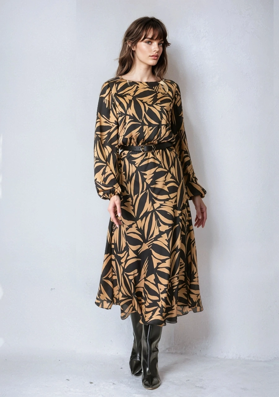Φόρεμα εμπριμέ σατέν σε ψηφιακή εκτύπωση χρωμάτων. Διαθέτει ελαστική φόδρα εσωτερικά και λάστιχο στη μέση και τα μανίκια. Ελληνικής παραγωγής.