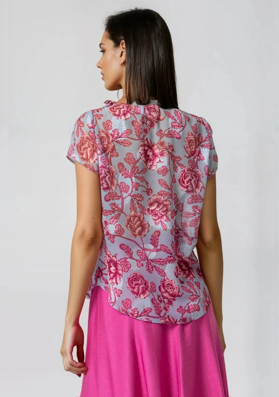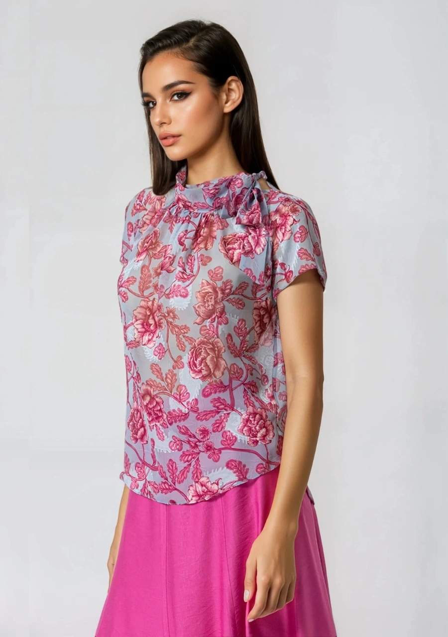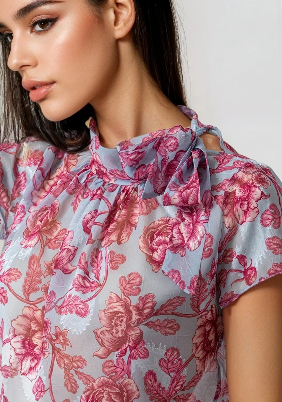 Μπλούζα μουσελίνα ζακάρ εμπριμέ κοντομάνικη με δέσιμο στο λαιμό γυναικεία σε ύφασμα με ψηφιακή εκτύπωση. Ελληνικής παραγωγής.