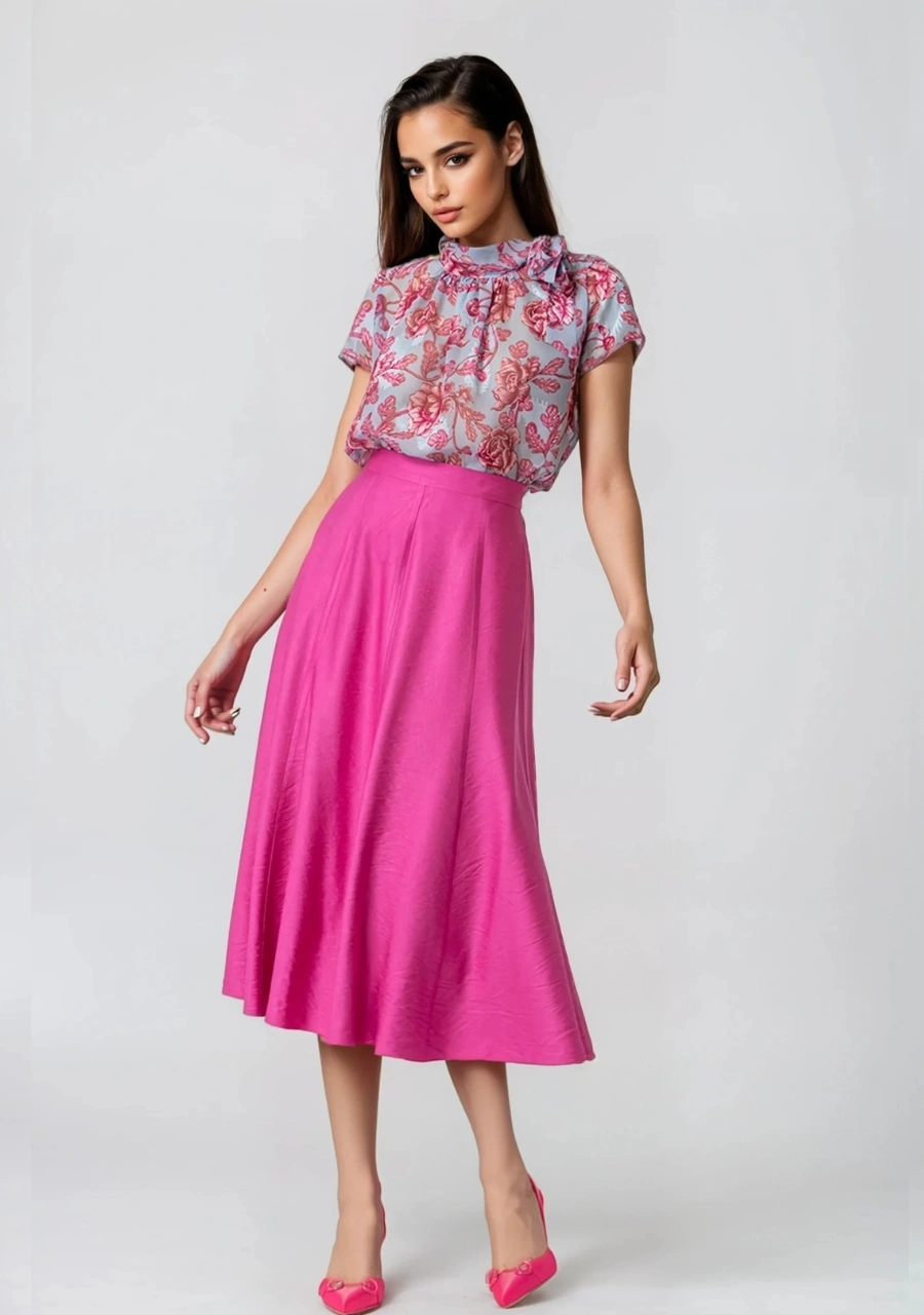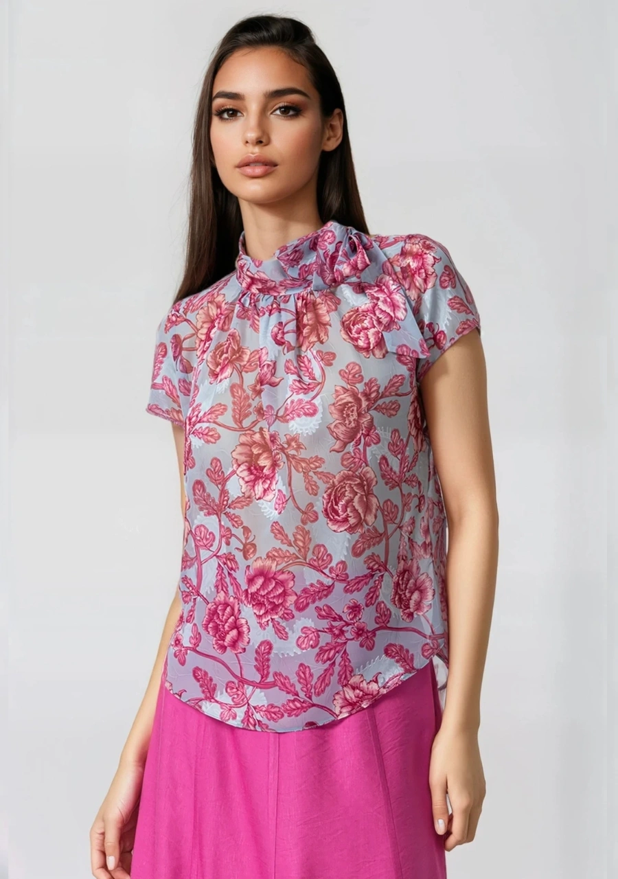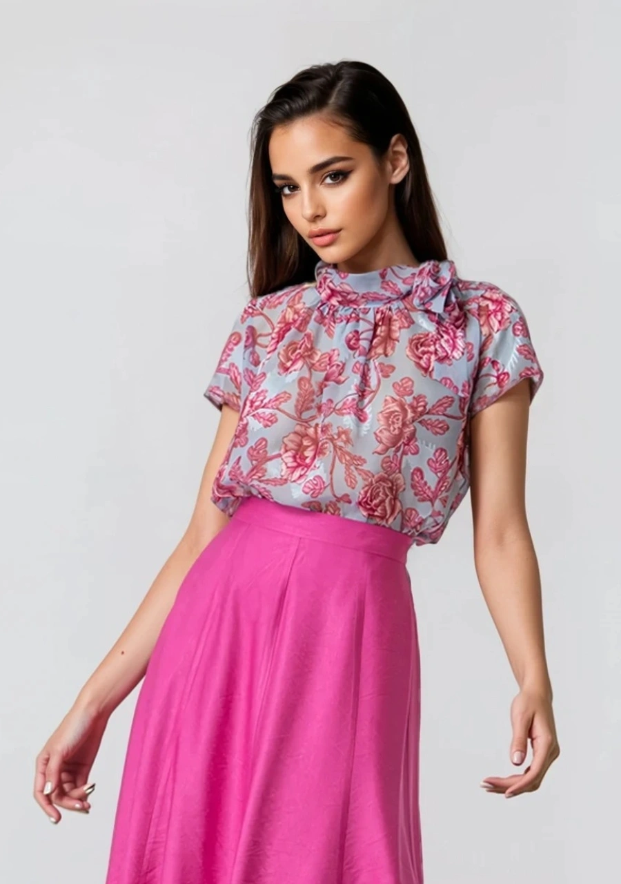 Μπλούζα μουσελίνα ζακάρ εμπριμέ κοντομάνικη με δέσιμο στο λαιμό γυναικεία σε ύφασμα με ψηφιακή εκτύπωση. Ελληνικής παραγωγής.